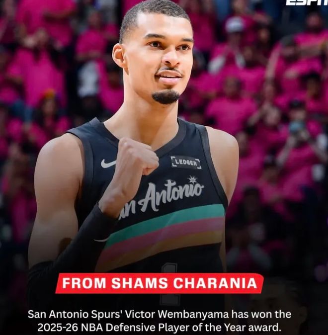 4月21日,马刺球员文班亚马获得25-26赛季NBA年度最佳防守球员,同时文班亚马也是获得最佳防守球员最年轻的人,而且他是全票当选,实至名归!